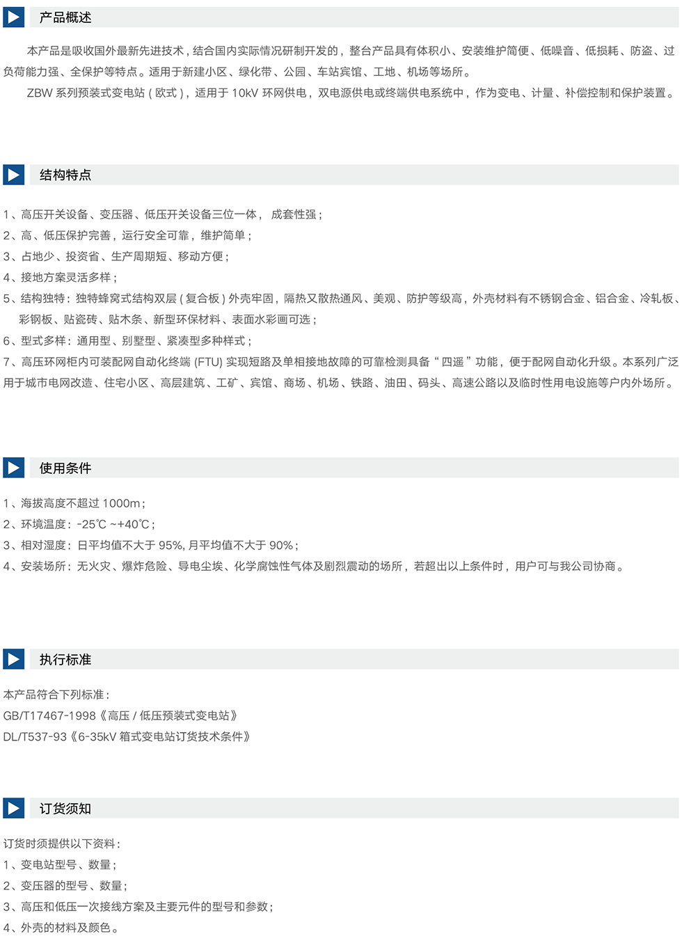 ZBW系列预装式变电站(欧式),适用于10kV环网供电,双电源供电或终端供电系统中,作为变电、计量、补偿控制和保护装置。