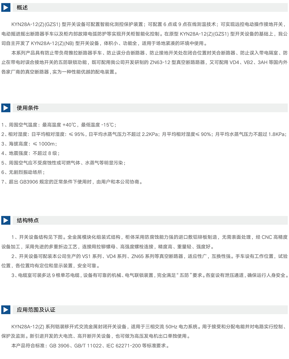 KYN28A-12(Z)(GZS1)型开关设备可配置智能化测控保护装置;可配置6点或9点在线测温技术;可实现远控电动操作接地开关,电动摇进摇出断路器手车以及柜内部故障电弧防护等实现开关柜智能化控制。在原型KYN28A-12(Z)(GZS1)型开关设备的基础上,我公司自主开发了KYN28A-12(Z)(NB)型开关设备,体积小、功能全,适用于场地紧凑的环境中使用。