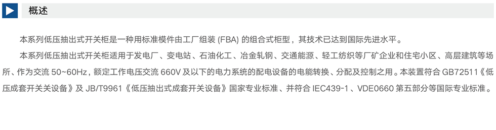 本系列低压抽出式开关柜是-种用标准模件由工厂组装(FBA)的组合式柜型,其技术已达到国际先进水平。