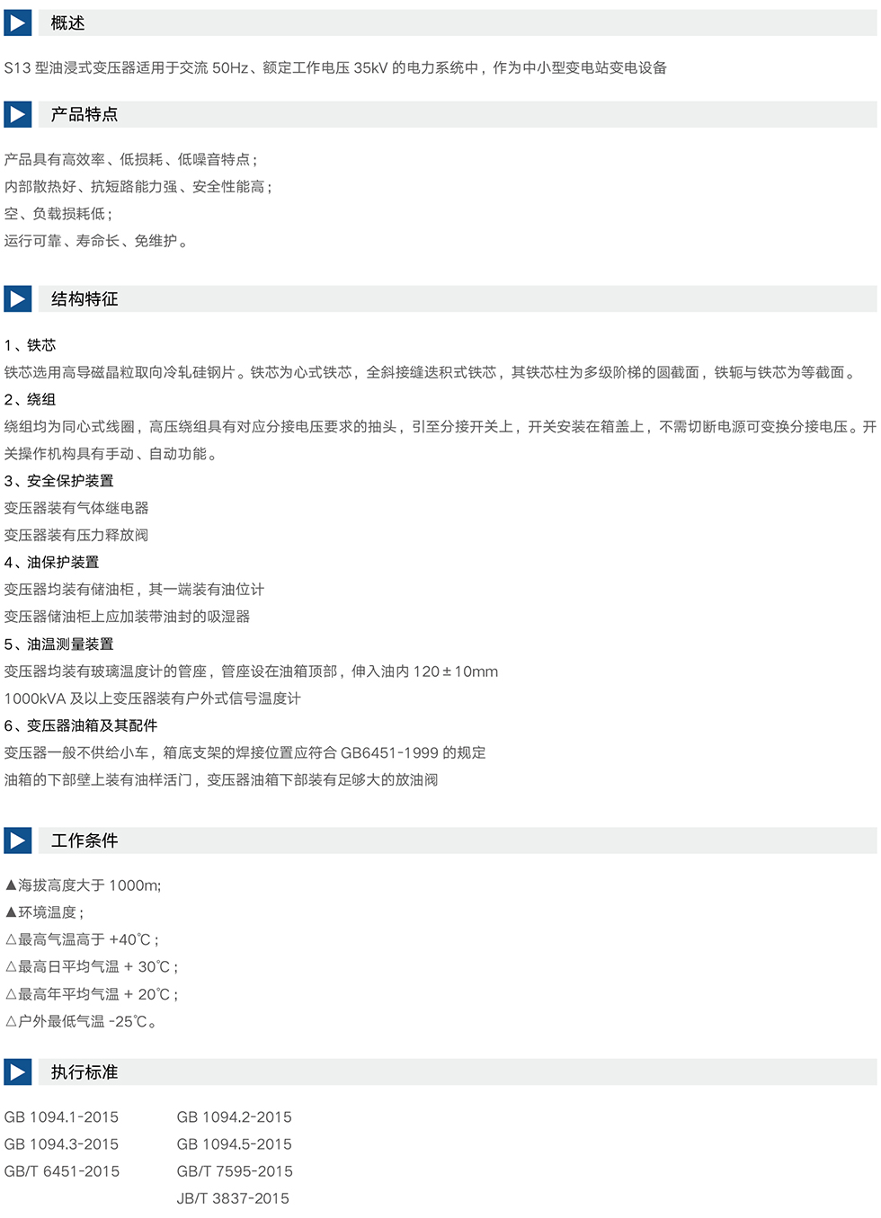 S13型油浸式变压器适用于交流50Hz、额定工作电压35kV的电力系统中,作为中小型变电站变电设备。
