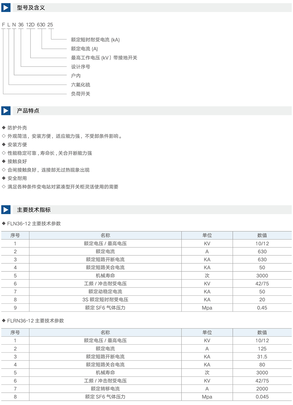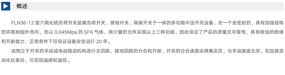 FLN36-12型六氧化硫负荷开关是集负荷开关、接地开关、隔离开关于一体的多功能中压开关设备,在一个全密封的,具有加强结构的环氧树脂外壳内,充以0.045Mpa的SF6气体,用少量的元件实现以上三种功能,因此保证了产品的质量及可靠性,具有极佳的绝缘和开断能力,正常条件下可保证设备安全运行20年。
