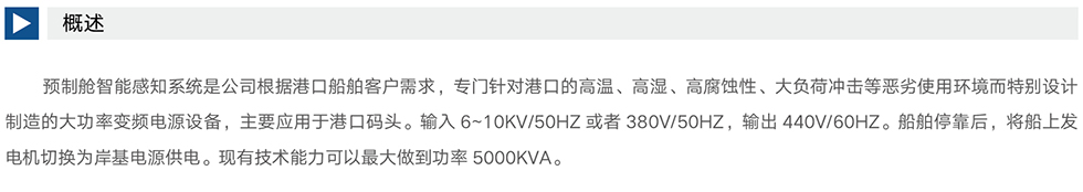 预制舱智能感知系统是公司根据港口船舶客户需求,专门针对港口的高温、高湿、高腐蚀性、大负荷冲击等恶劣使用环境而特别设计 制造的大功率变频电源设备,主要应用于港口码头。输入6~10KV/50HZ或者380V/50HZ,输出440V/60HZ。船舶停靠后,将船上发 电机切换为岸基电源供电。现有技术能力可以最大做到功率5000KVA。